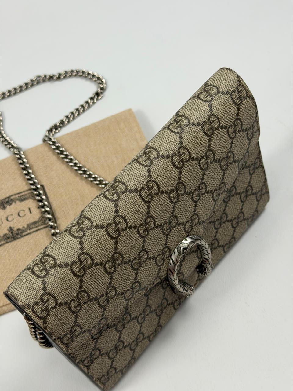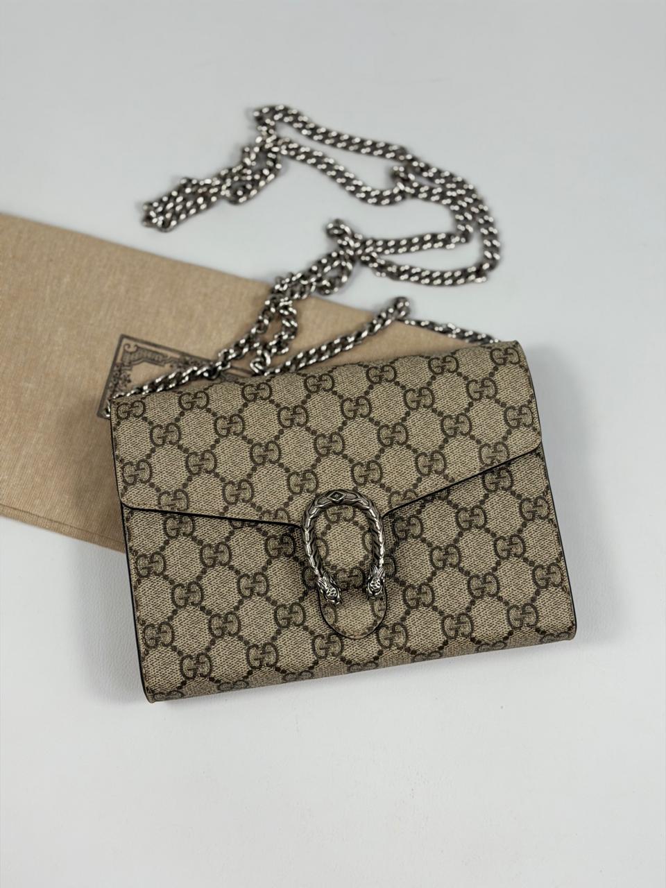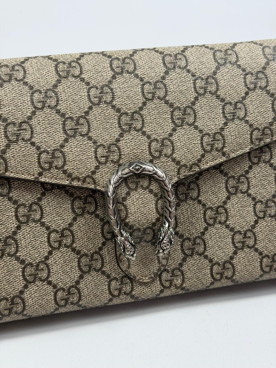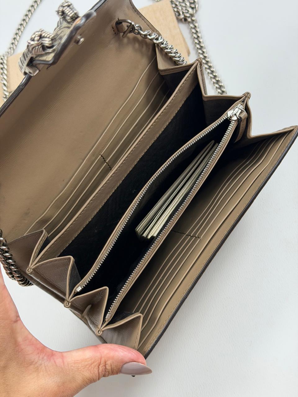 O modelo é caracterizado pelo fecho estruturado em formato de ferradura com cabeças de tigre, uma referência ao deus grego Dionísio. Esta versão específica apresenta o monograma clássico da marca em tons de bege e marrom, acompanhada de uma alça de corrente prateada removível, permitindo que seja usada como bolsa tiracolo ou carteira de mão.