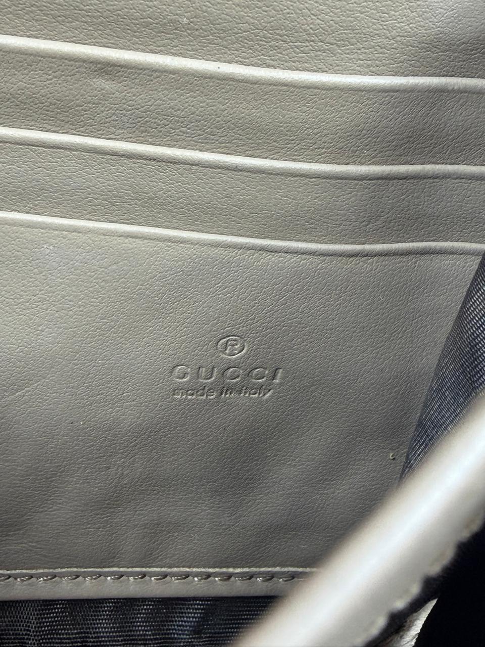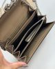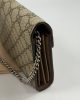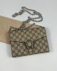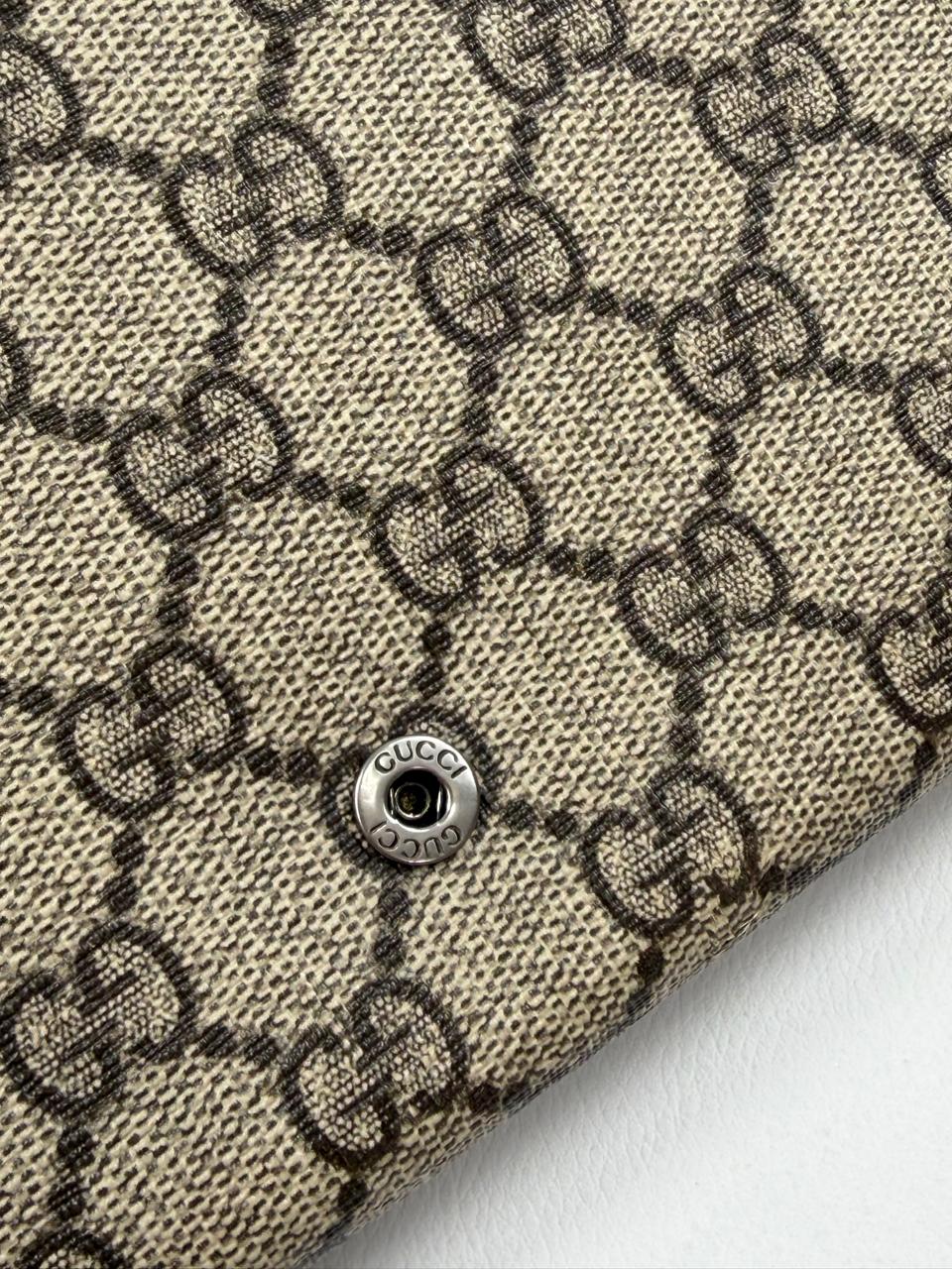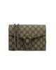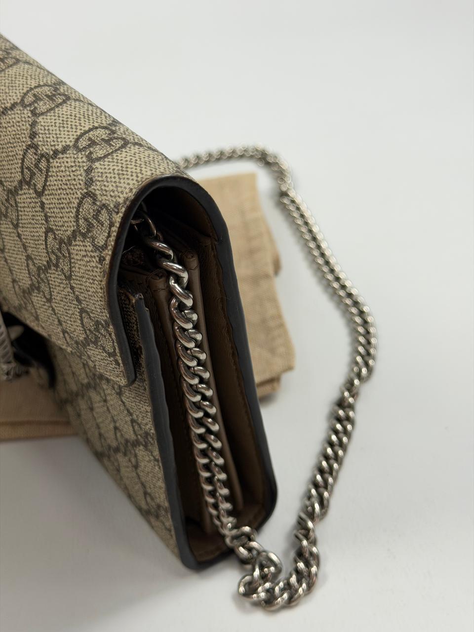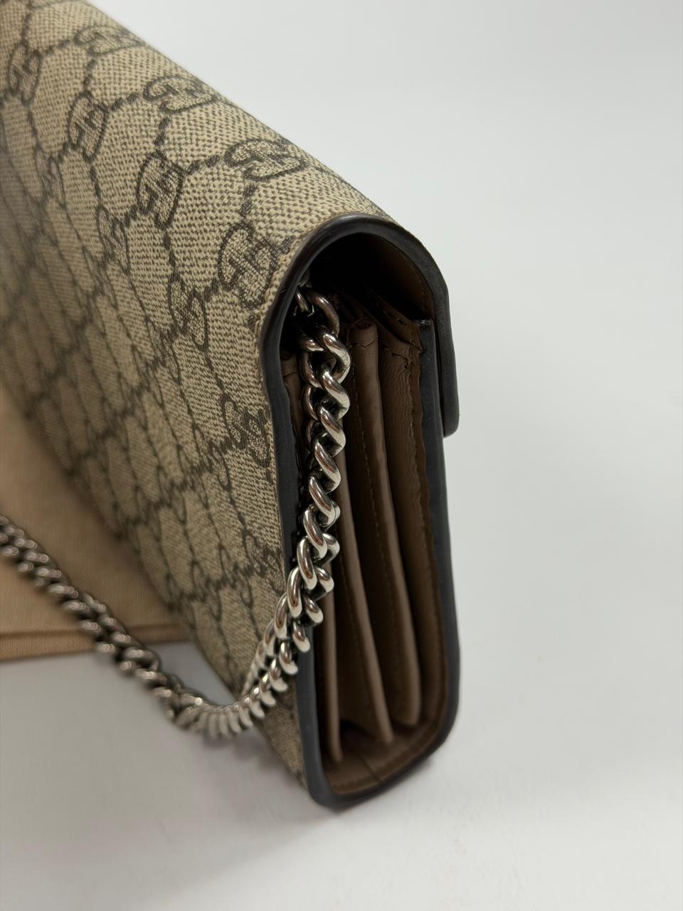 O modelo é caracterizado pelo fecho estruturado em formato de ferradura com cabeças de tigre, uma referência ao deus grego Dionísio. Esta versão específica apresenta o monograma clássico da marca em tons de bege e marrom, acompanhada de uma alça de corrente prateada removível, permitindo que seja usada como bolsa tiracolo ou carteira de mão.