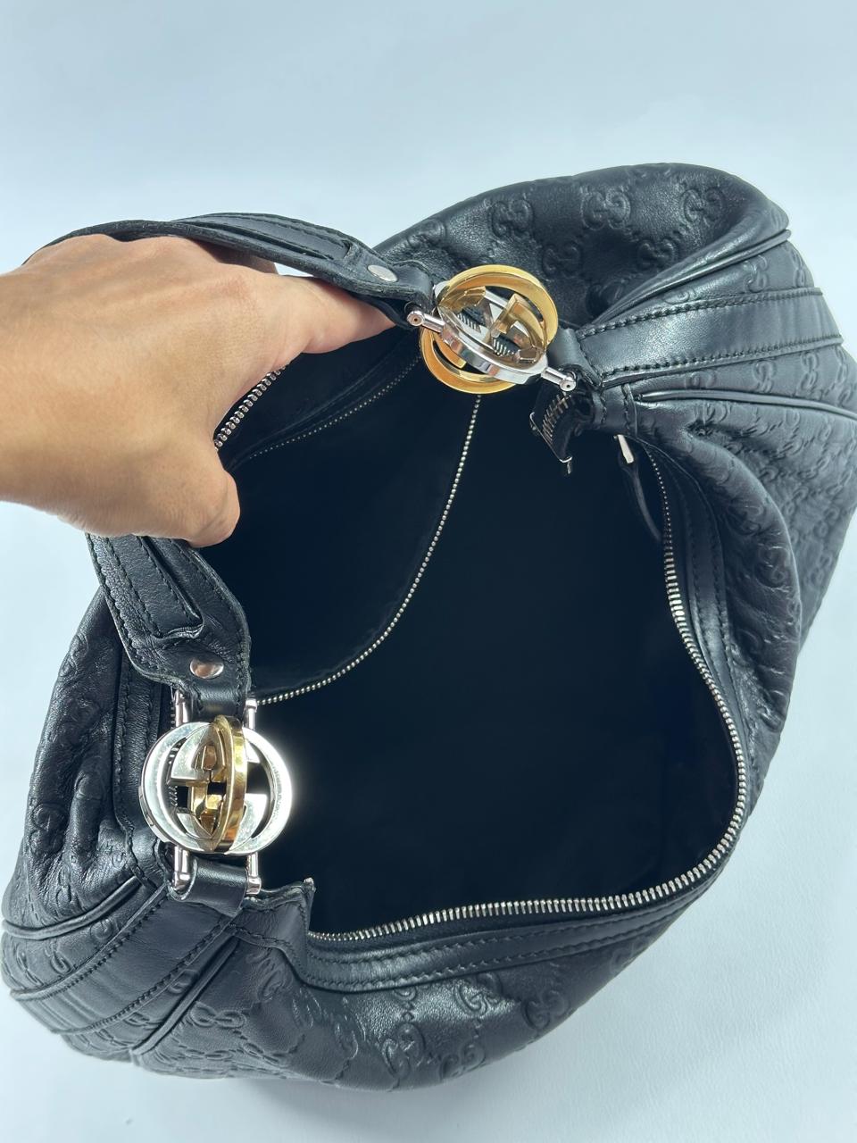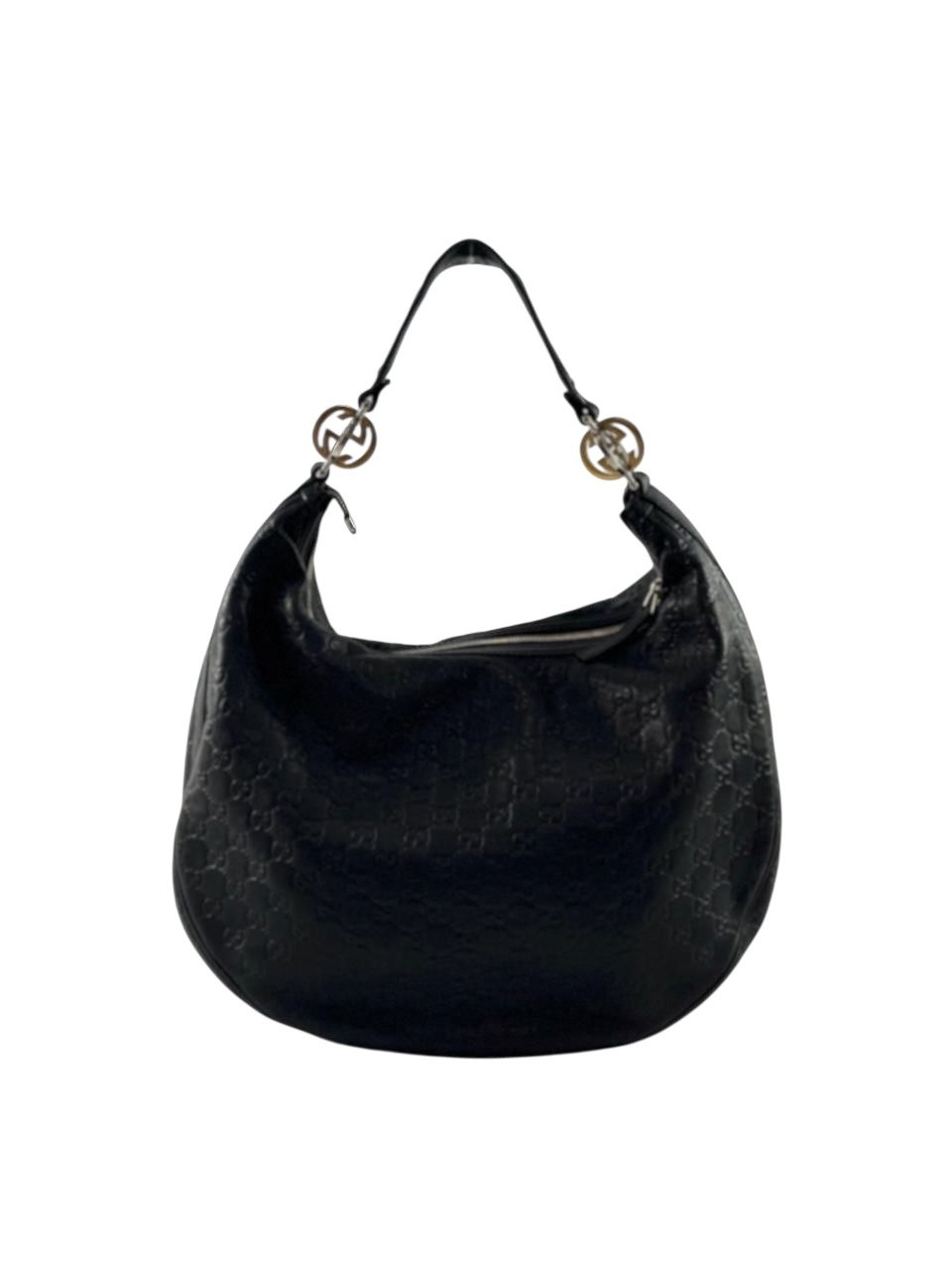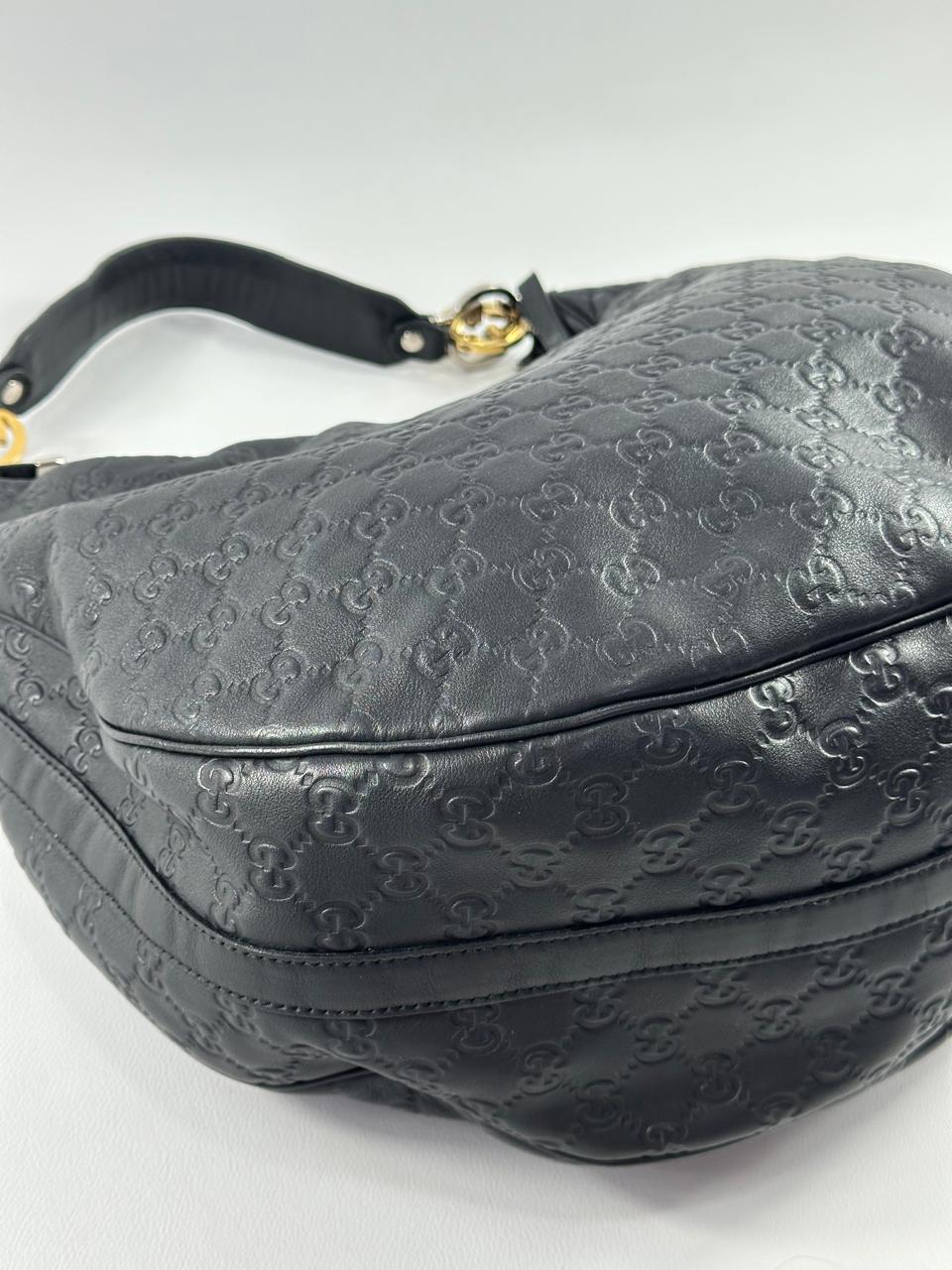Esta é uma autêntica bolsa Gucci Guccissima Medium GG Twins Hobo na cor preta. Esta bolsa elegante é confeccionada em couro preto com o monograma Gucci GG em relevo.