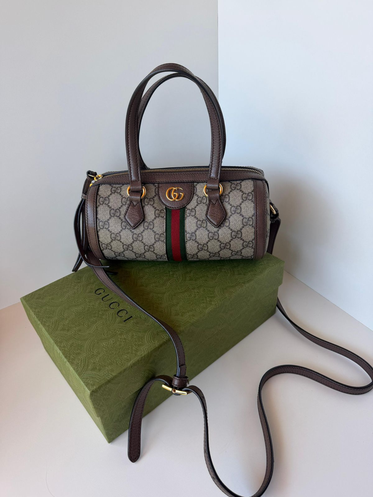 Esta é uma autêntica bolsa  GUCCI GG Supreme Monogram Textured Calfskin Web Small Ophidia GG em bege e ébano.