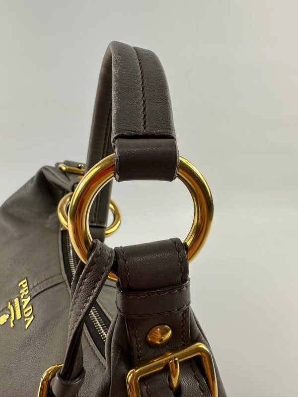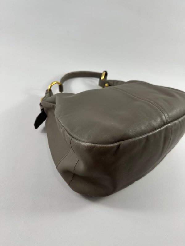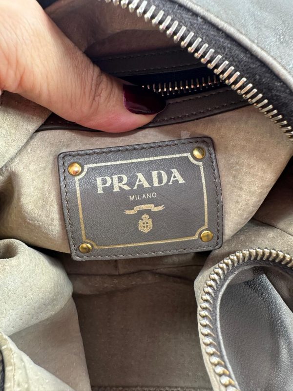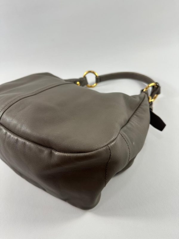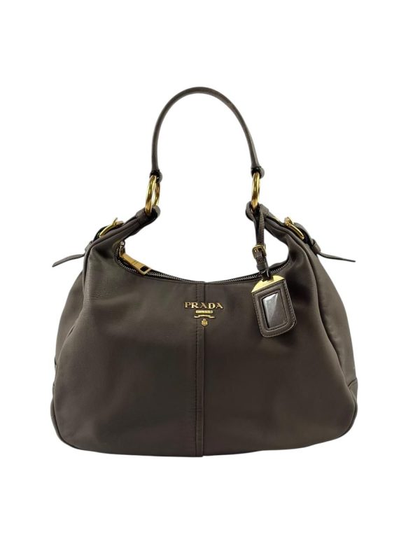 Bolsa Prada Vitello Daino Hobo Cinza original confeccionada em couro na cor cinza. O modelo possui alça única de ombro, dois bolsos internos, sendo um com fecho por zíper, fecho principal por zíper e ferragens douradas.