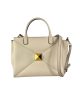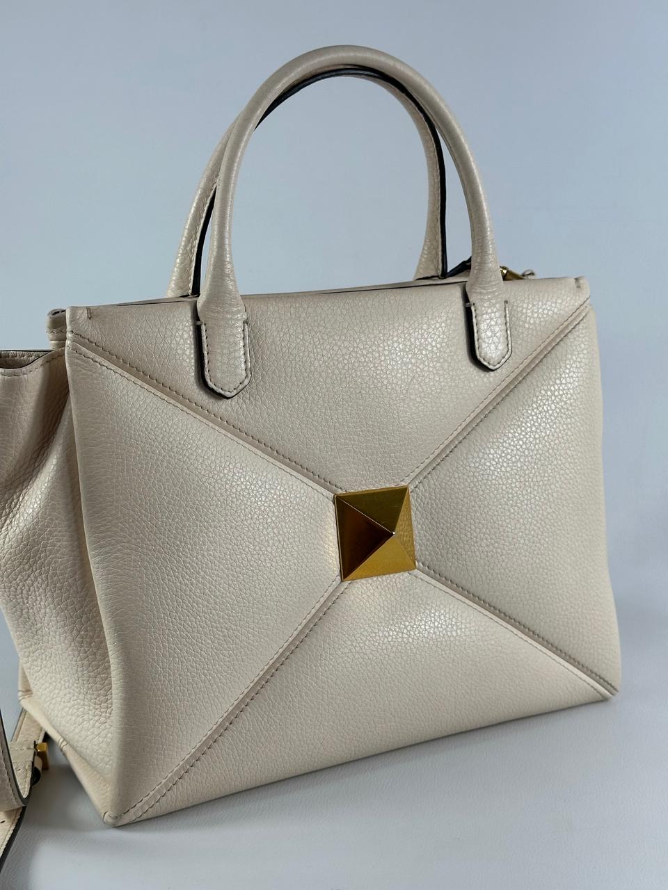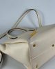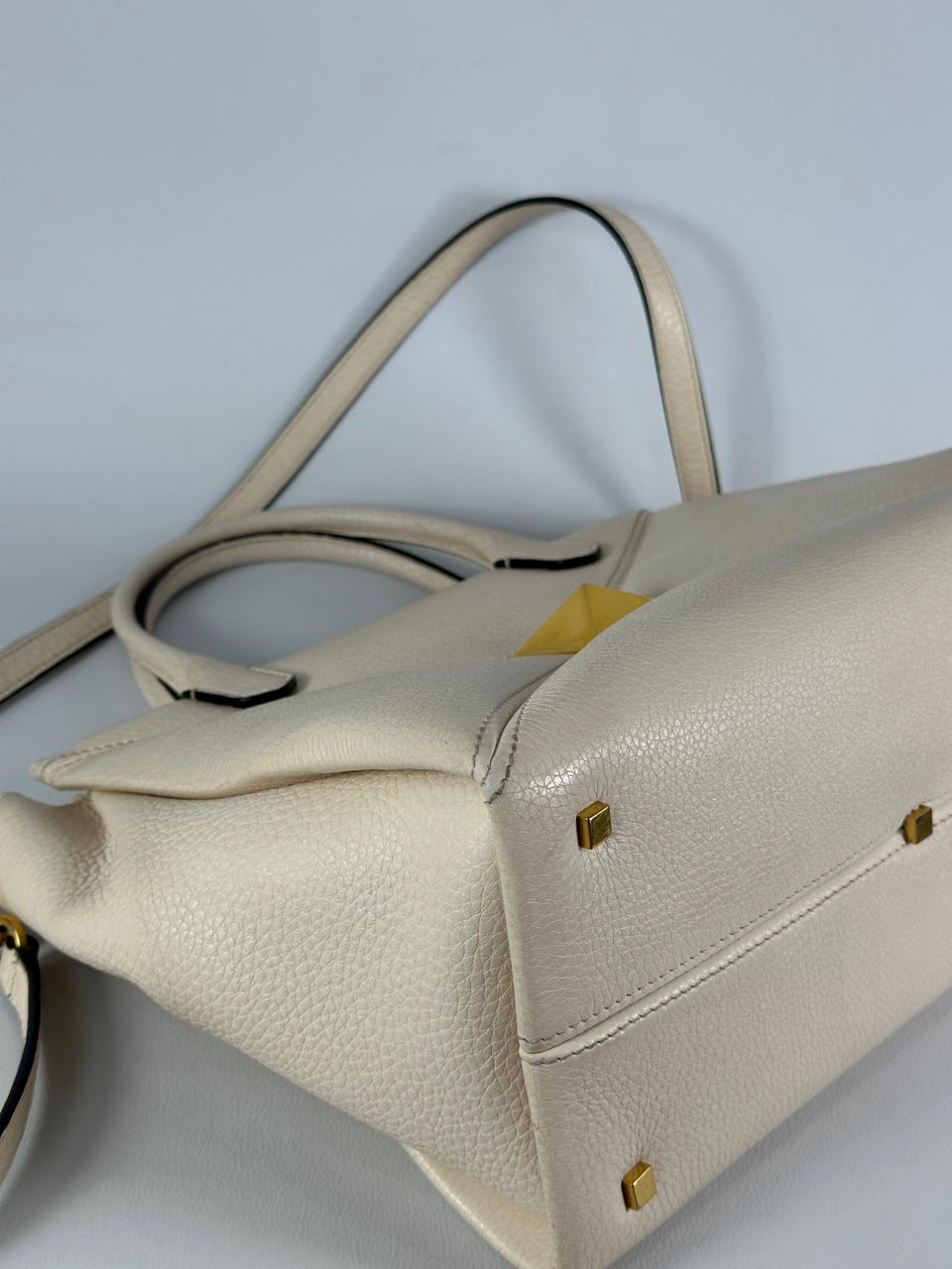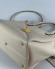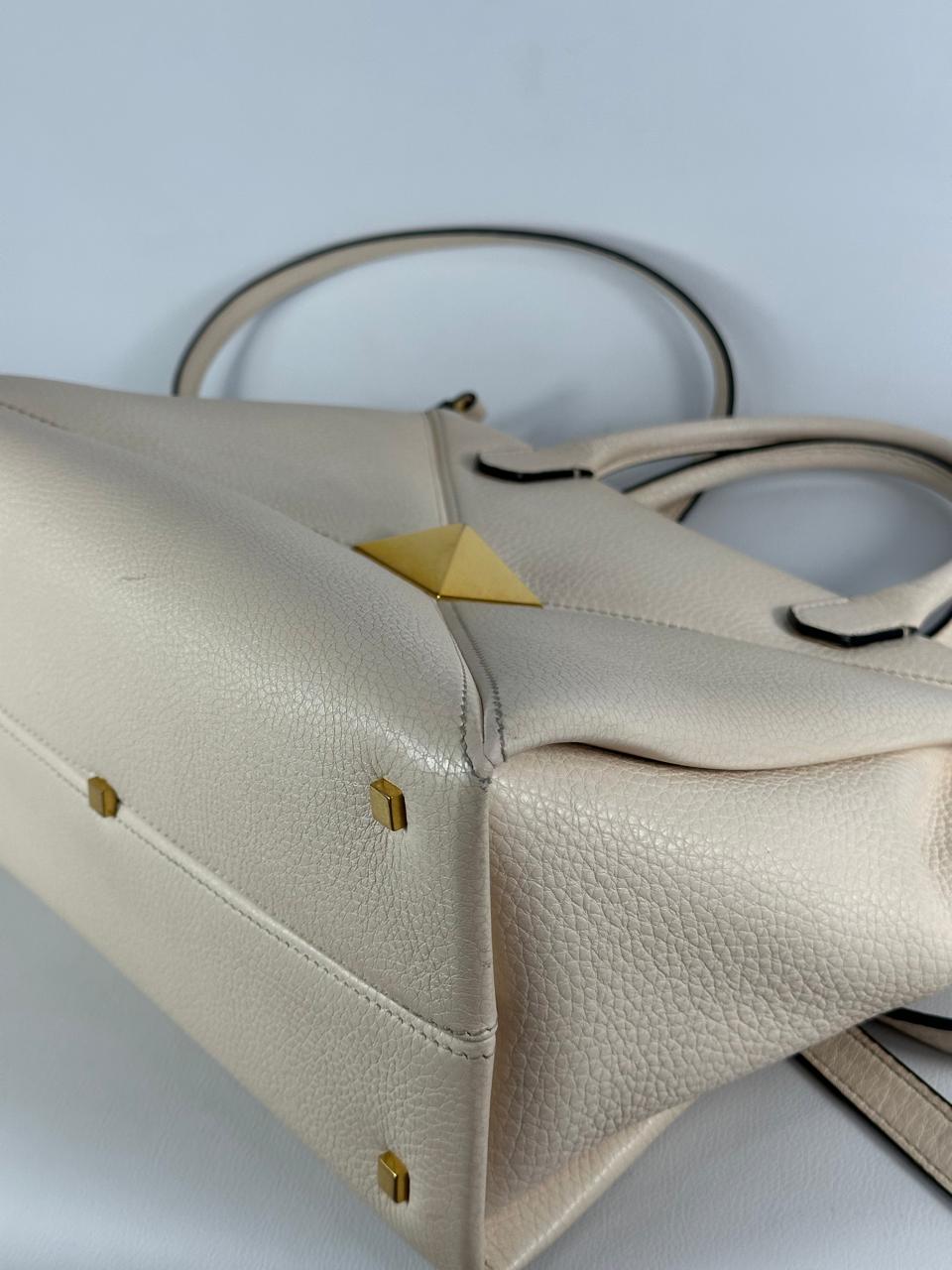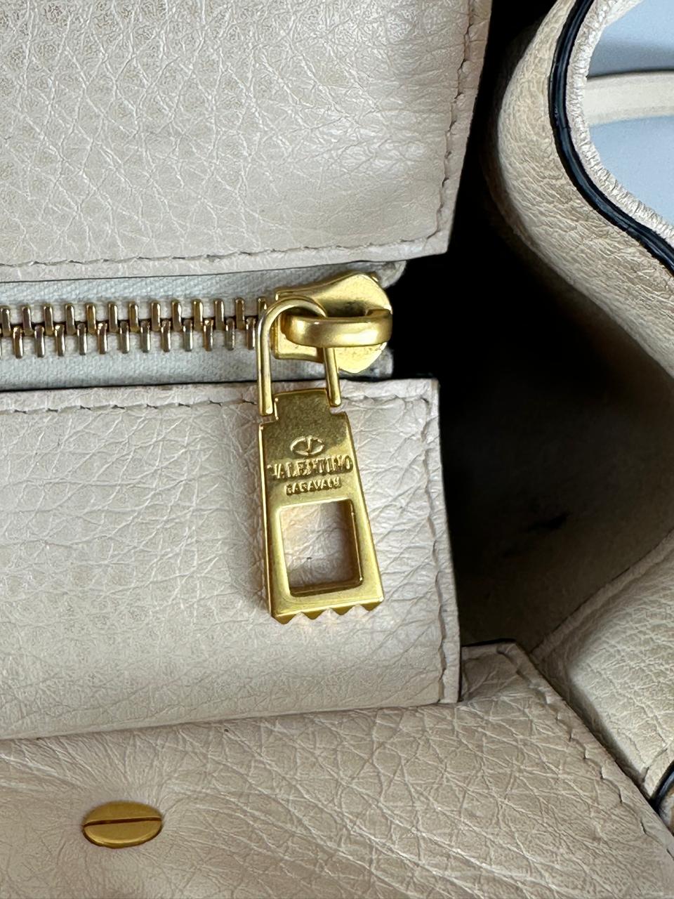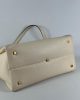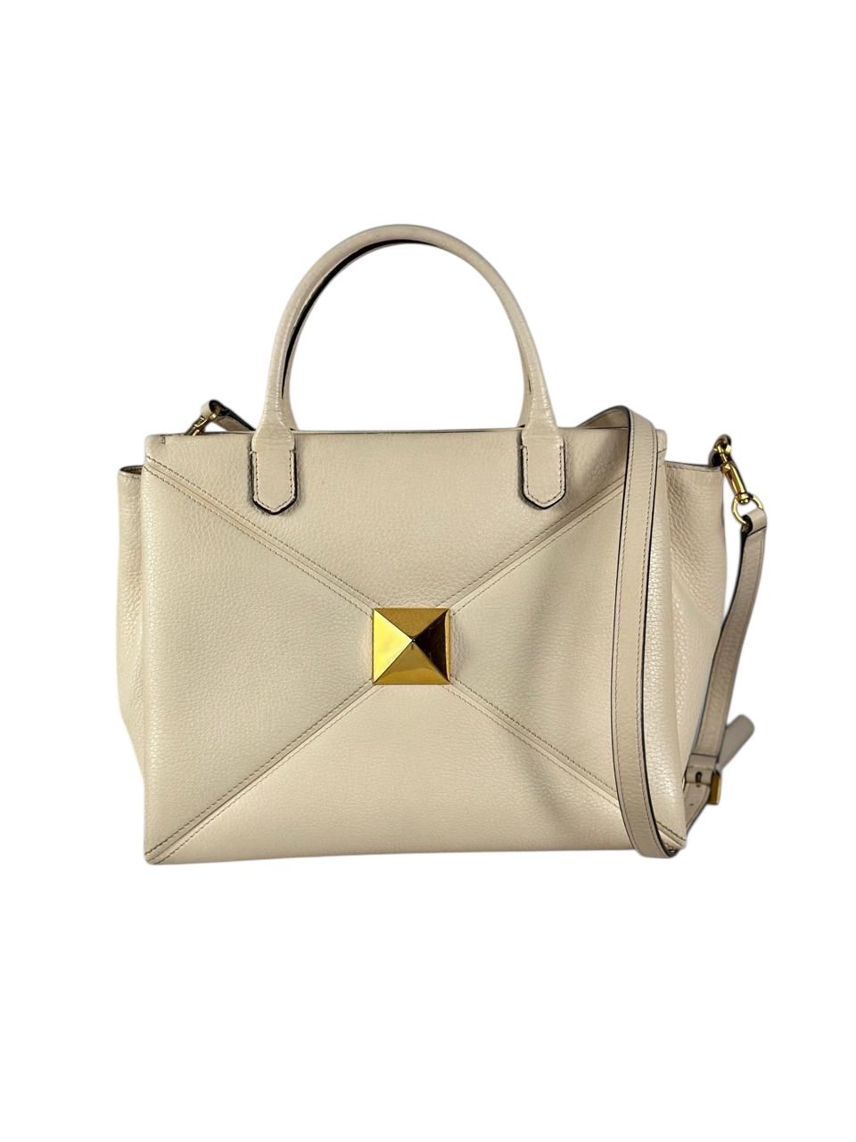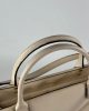 Esta bolsa apresenta um corpo de couro, alças superiores de couro enroladas, uma alça de couro plana destacável, um fecho de zíper na parte superior e bolsos internos com zíper e de deslize.