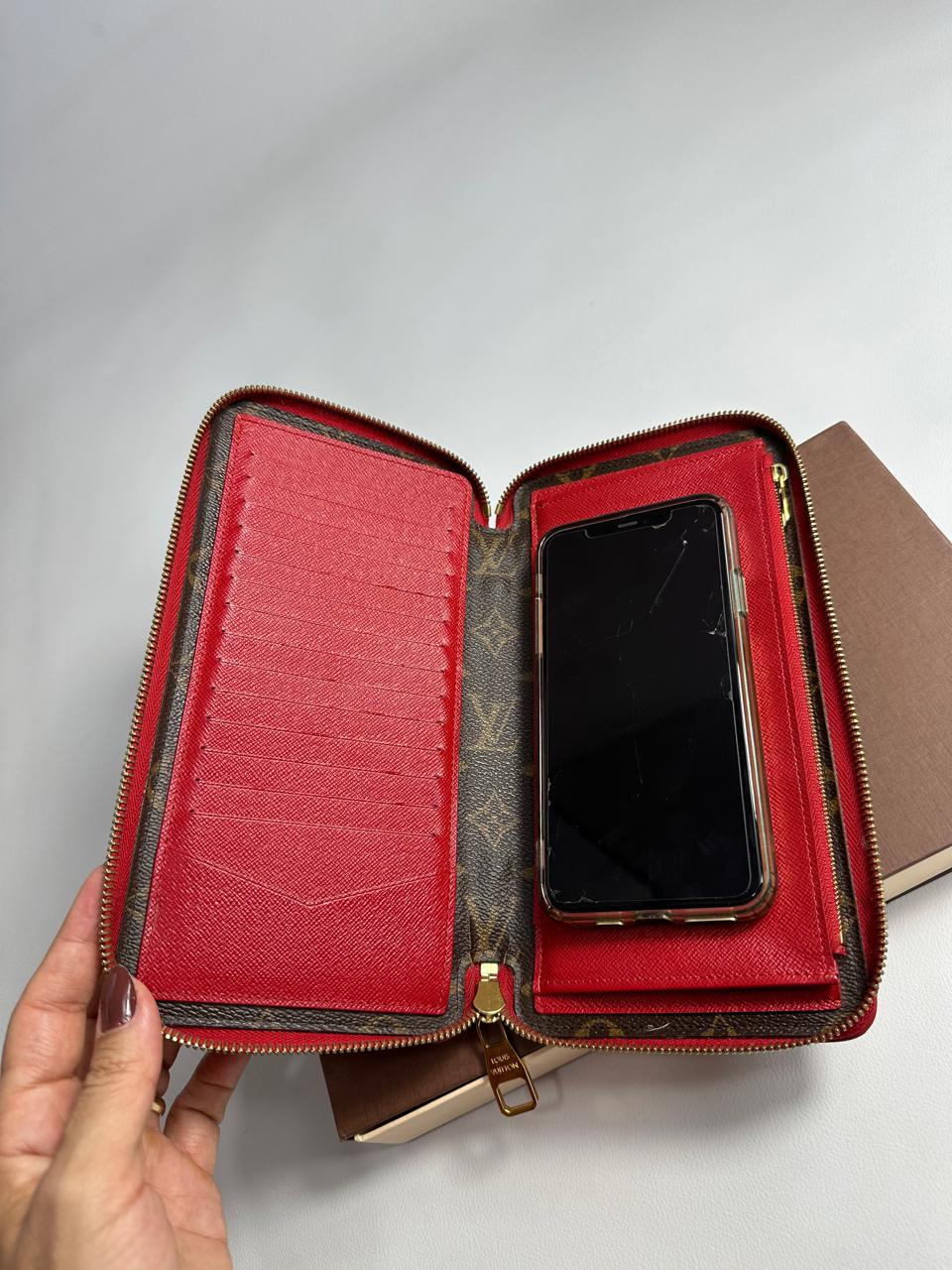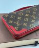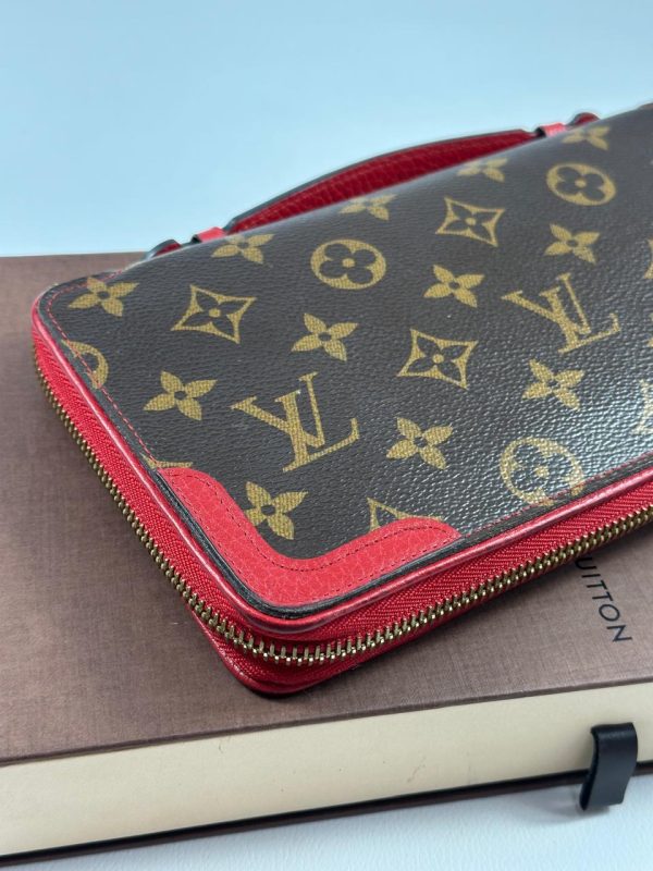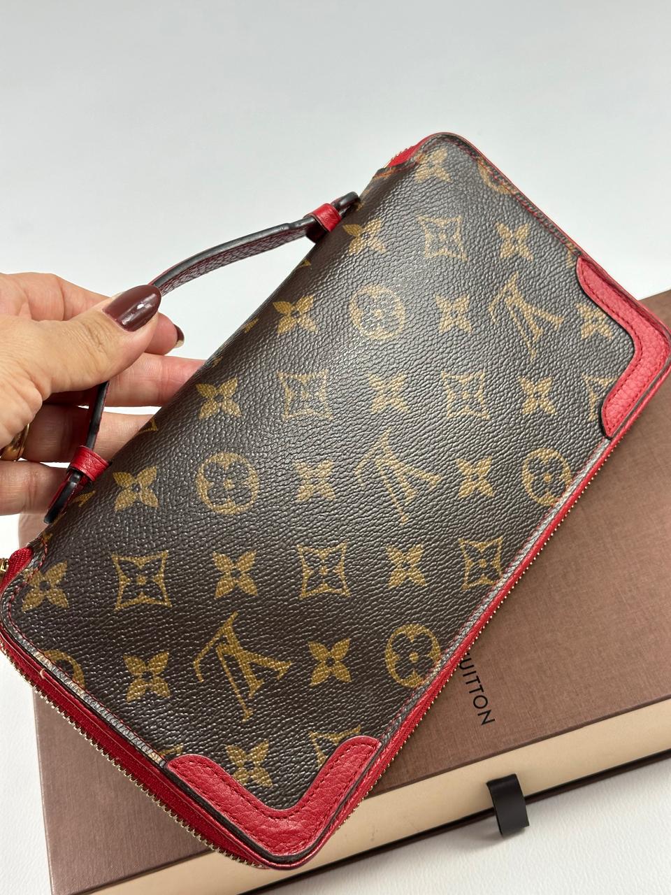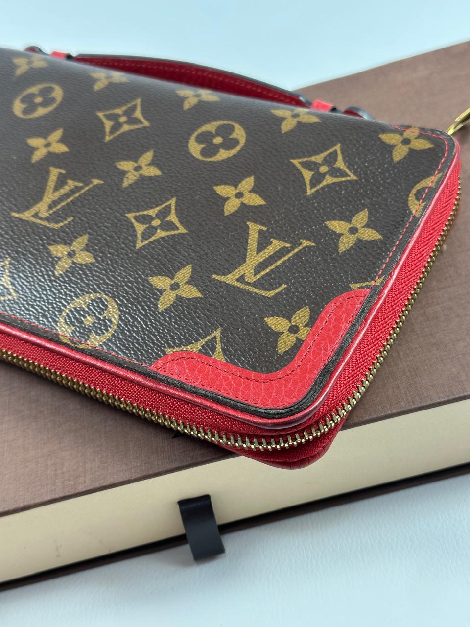 Este é um autêntico organizador diário Monogram da LOUIS VUITTON na cor cereja. Este elegante organizador é feito de lona tradicional Louis Vuitton revestida com monograma, com alça superior em couro vermelho e reforços nos cantos. O zíper envolvente abre para um interior em couro vermelho com textura de grão cruzado, com um painel para cartões e um compartimento com zíper.