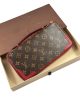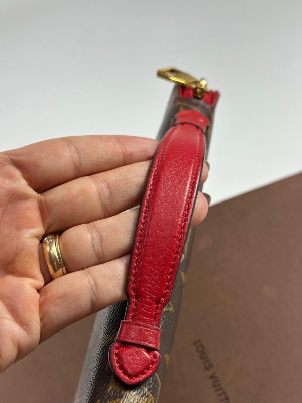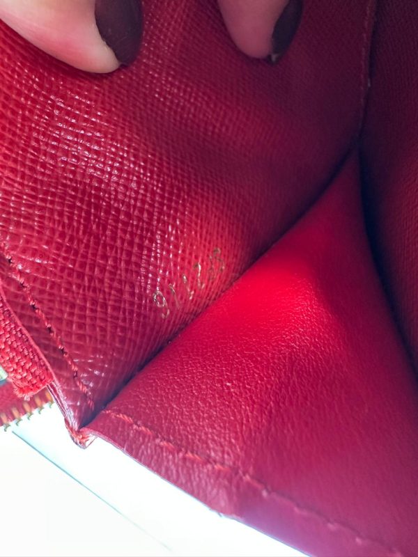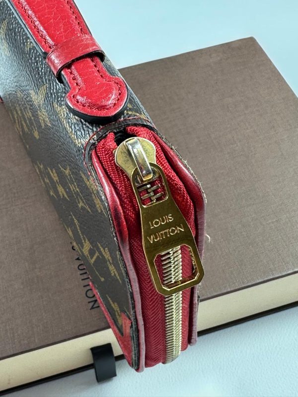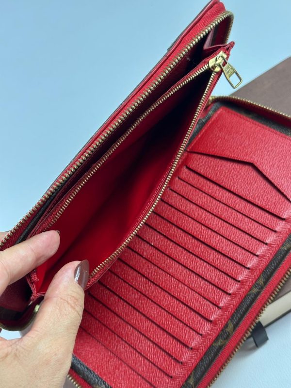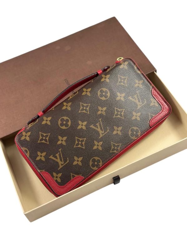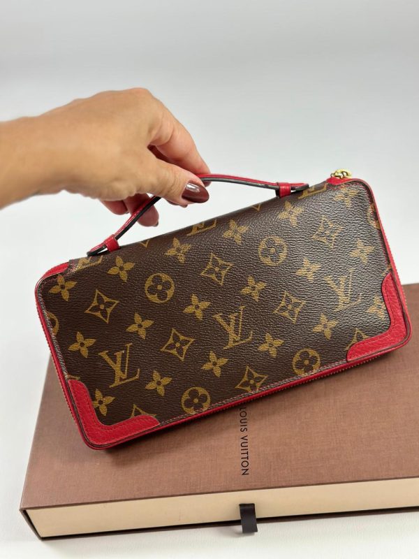 Este é um autêntico organizador diário Monogram da LOUIS VUITTON na cor cereja. Este elegante organizador é feito de lona tradicional Louis Vuitton revestida com monograma, com alça superior em couro vermelho e reforços nos cantos. O zíper envolvente abre para um interior em couro vermelho com textura de grão cruzado, com um painel para cartões e um compartimento com zíper.