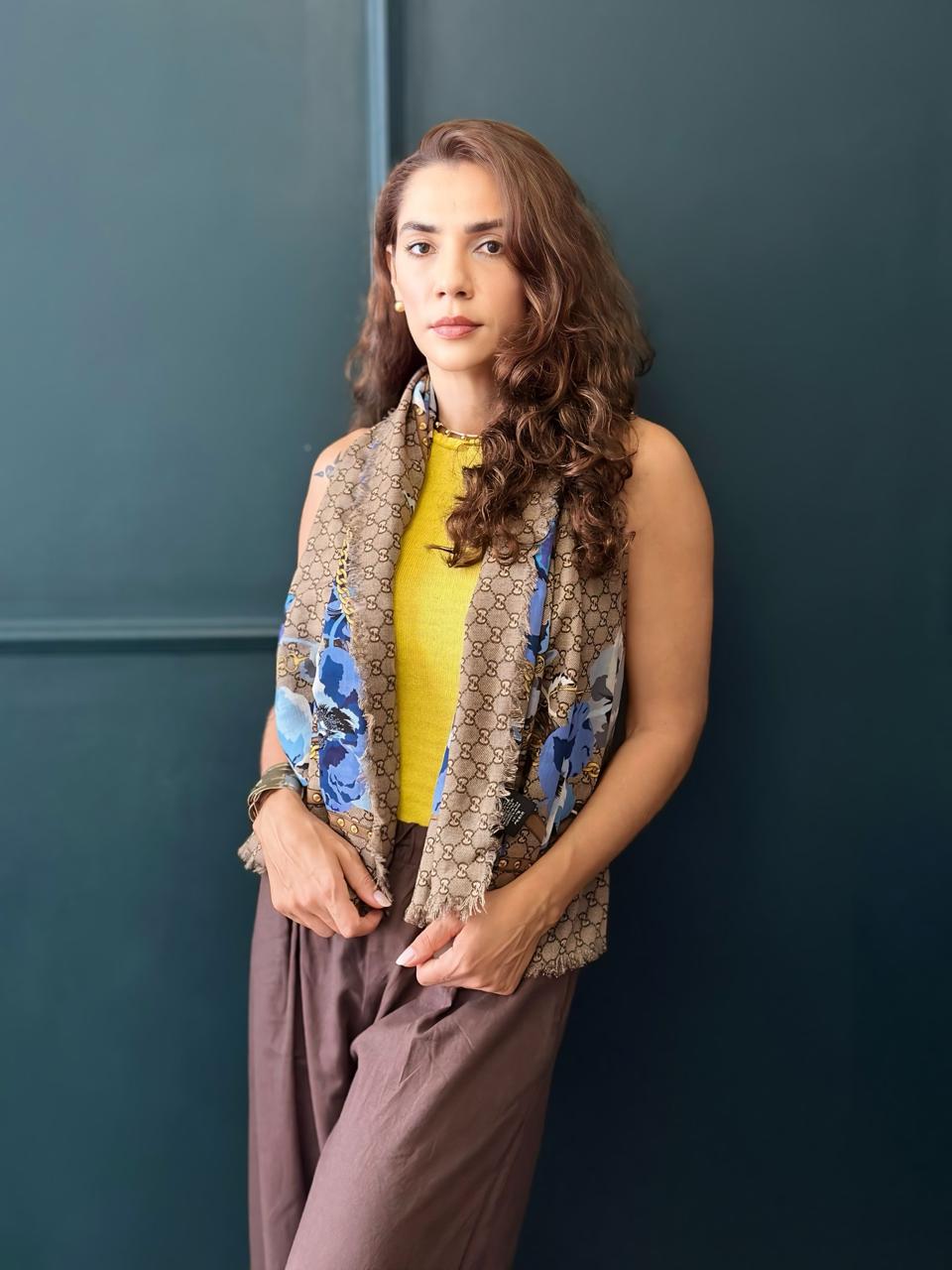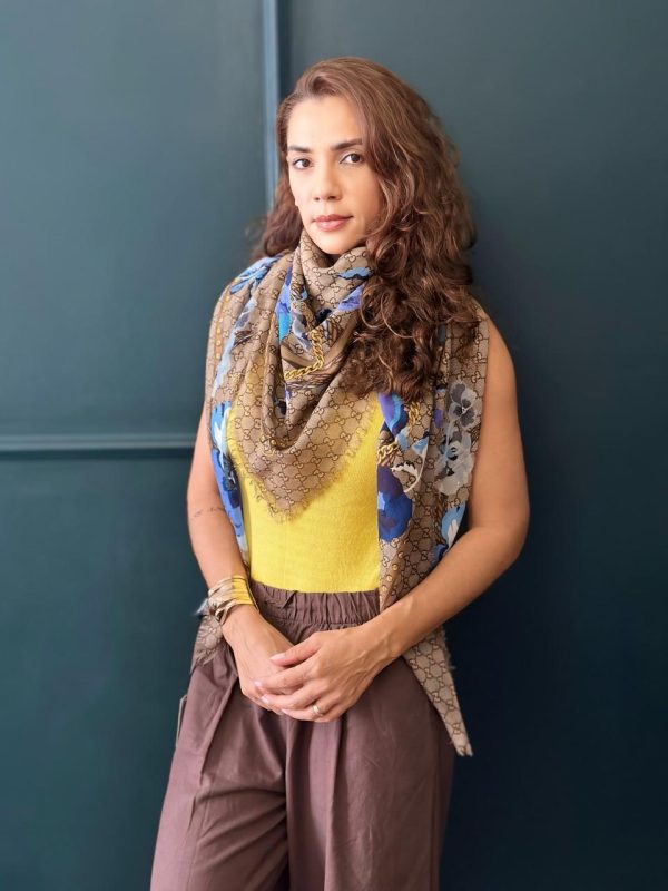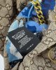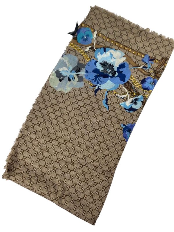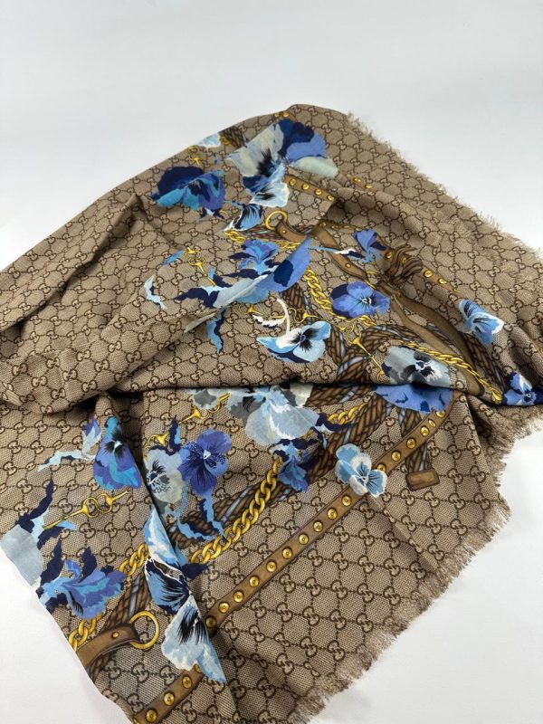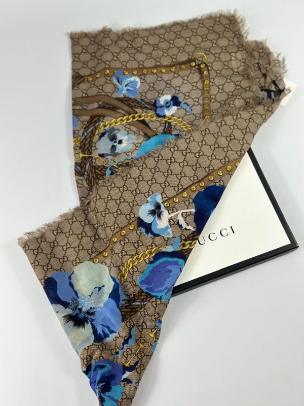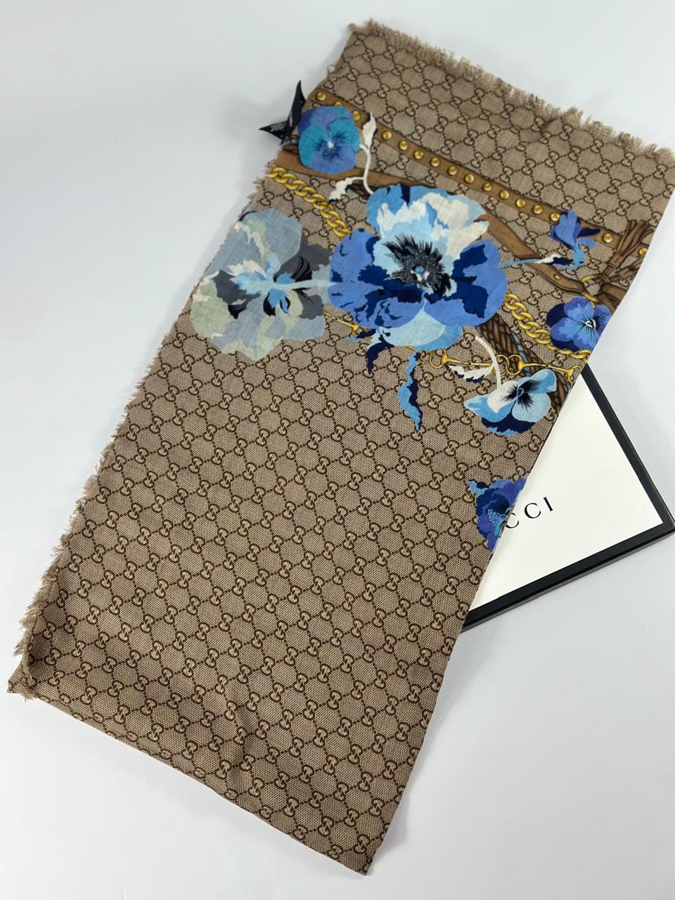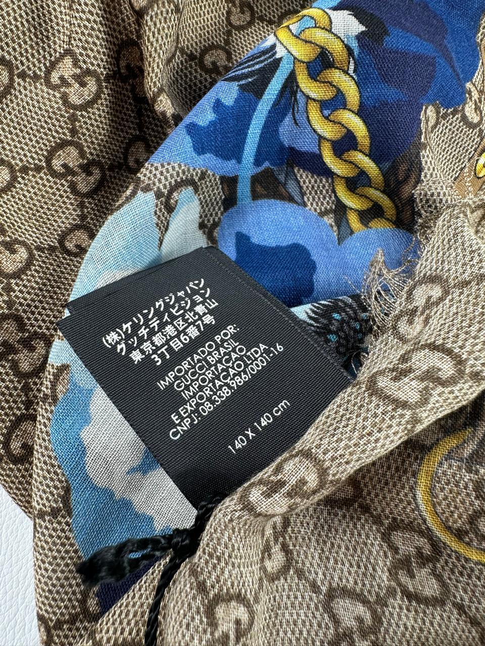 Autêntico Gucci fabuloso azul Oshibana Flowers GG correntes douradas echarpe de lã de 53″ quadrados . Acompanha a caixa da marca.